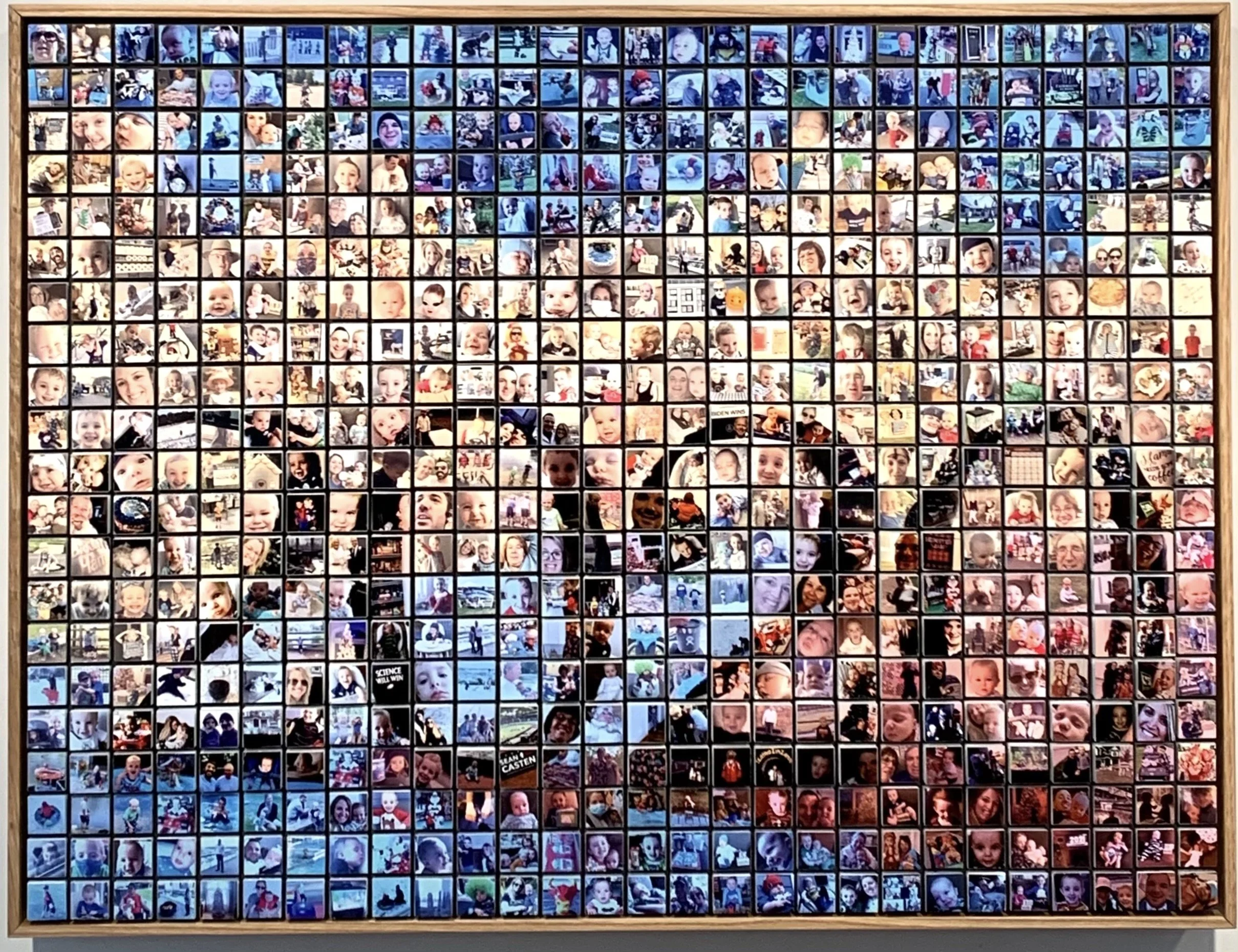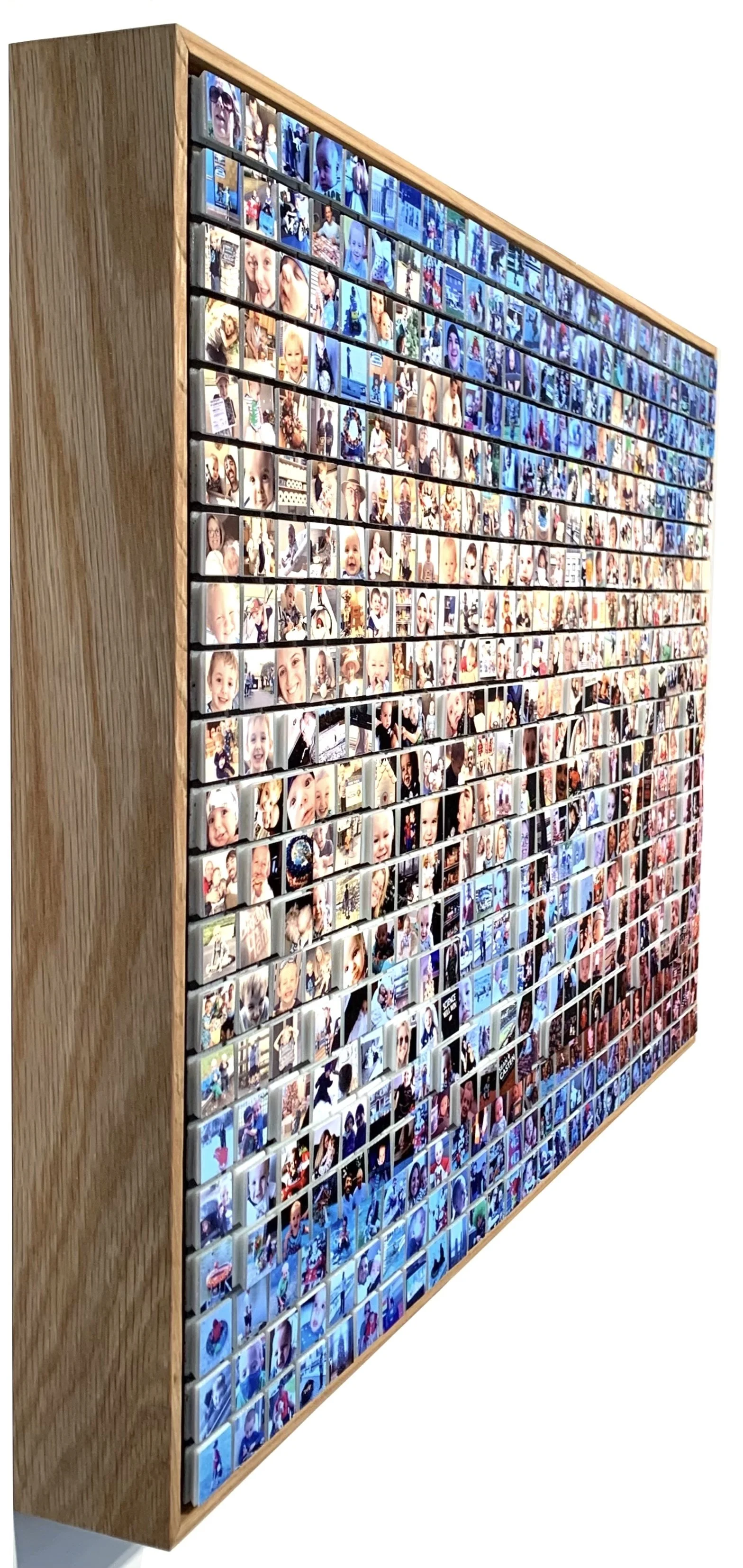 Iconic 3D Photo Mosaic pieces are created using a large number of personal, historical and/or subject appropriate images that are edited and put together to shape one grand image relating to the original photos used. From a distance, the subject is obvious, and as the viewer gets closer they will see that these pieces are made up of hundreds of individual photos that have been researched and altered (edited, cropped, retouched & color or b&w converted) to form the grand subject of the piece. Each image is adhered to a mosaic tile to give the work depth and a sculptural quality. Additionally, there are no duplicate images in any piece, which gives the viewer a more engaging experience, rather than simply looking at repetitious copies of a small number of images.